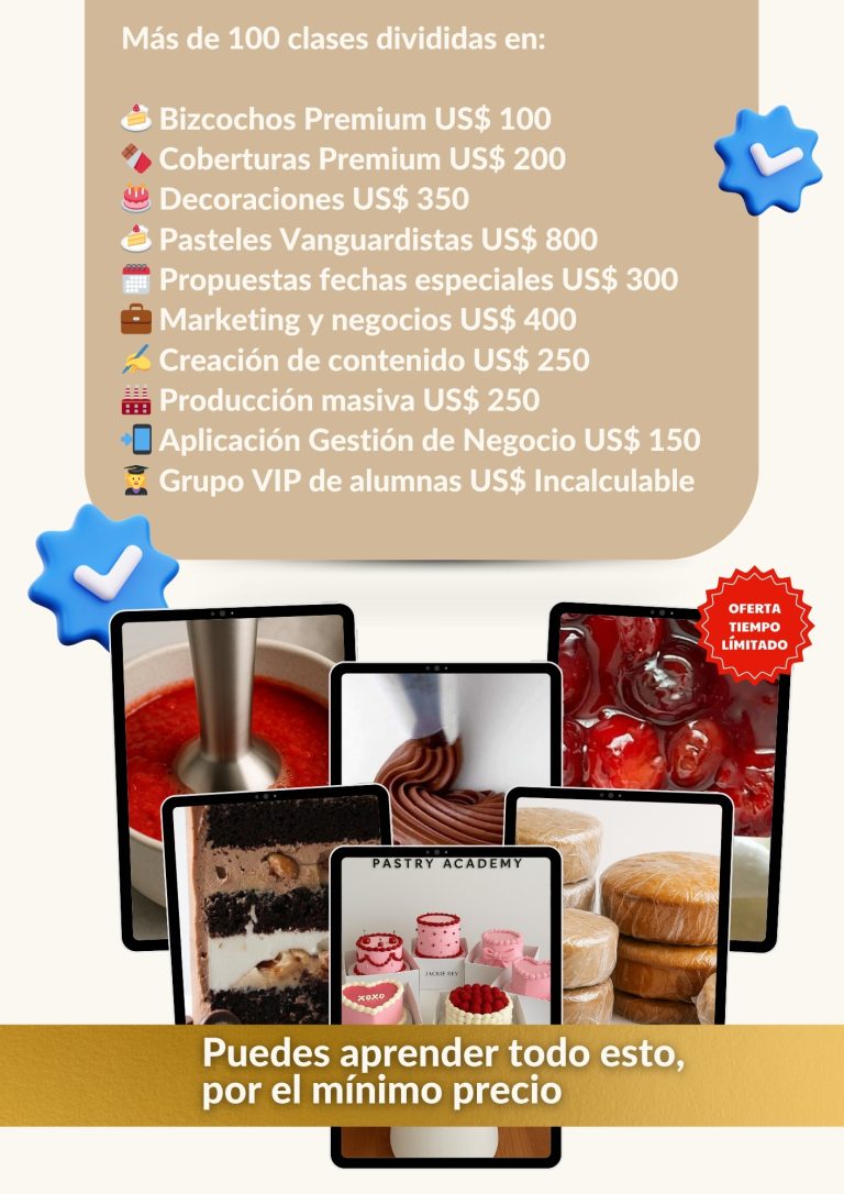 Aprendé pastelería premium, vendé con confianza y cobrando lo que valen tus productos.